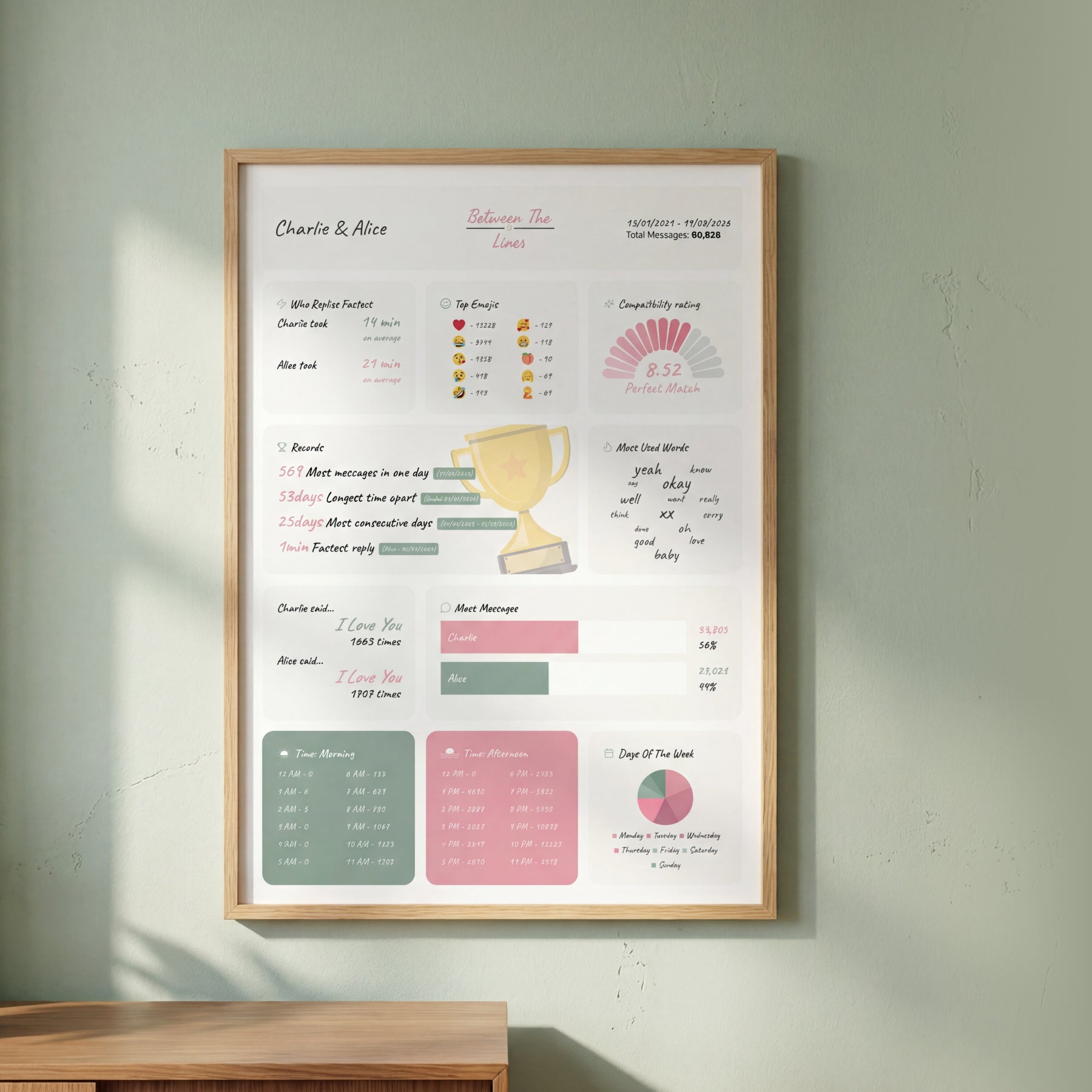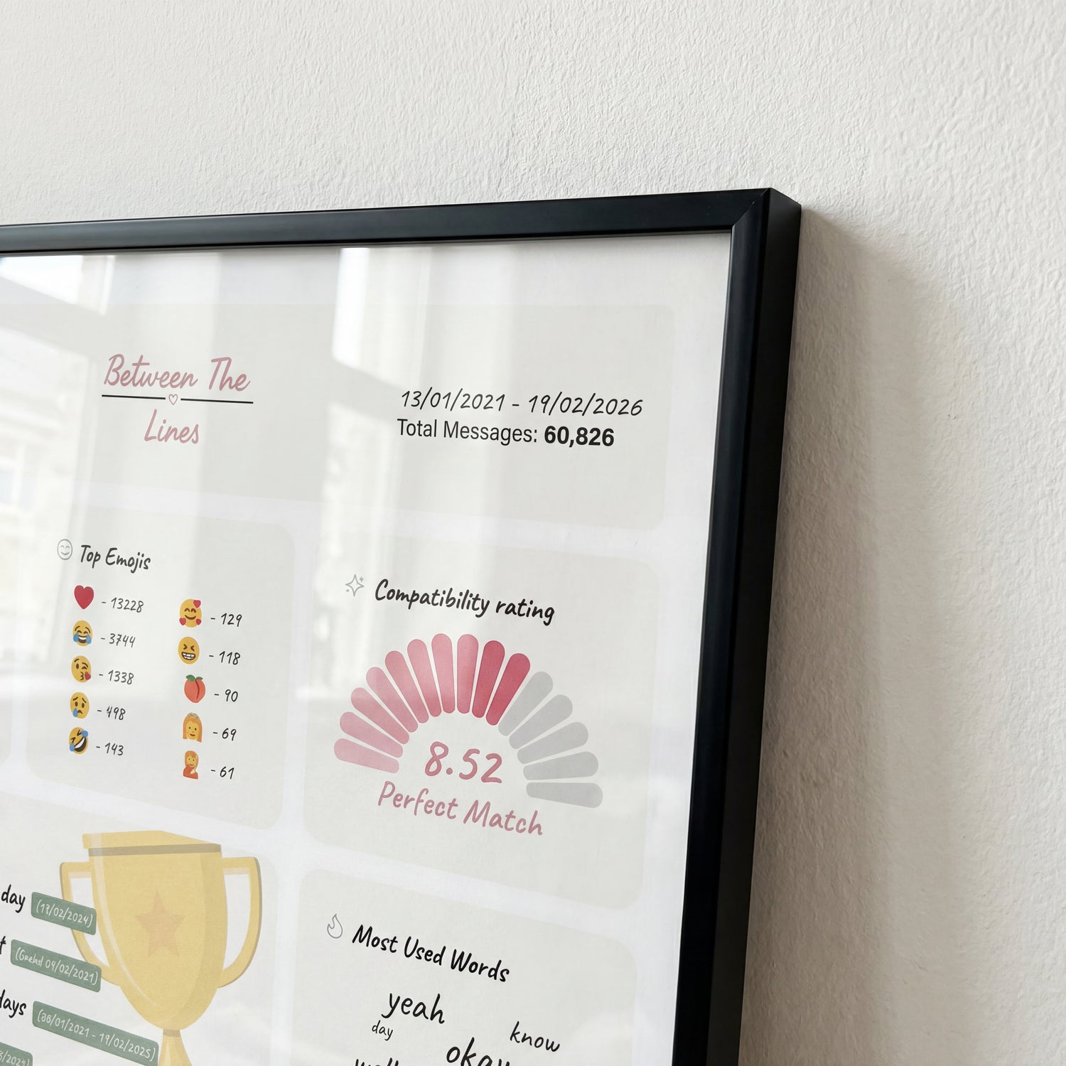 Create a personalised poster from your WhatsApp conversations - capturing the moments, patterns and little details that make your relationship yours.